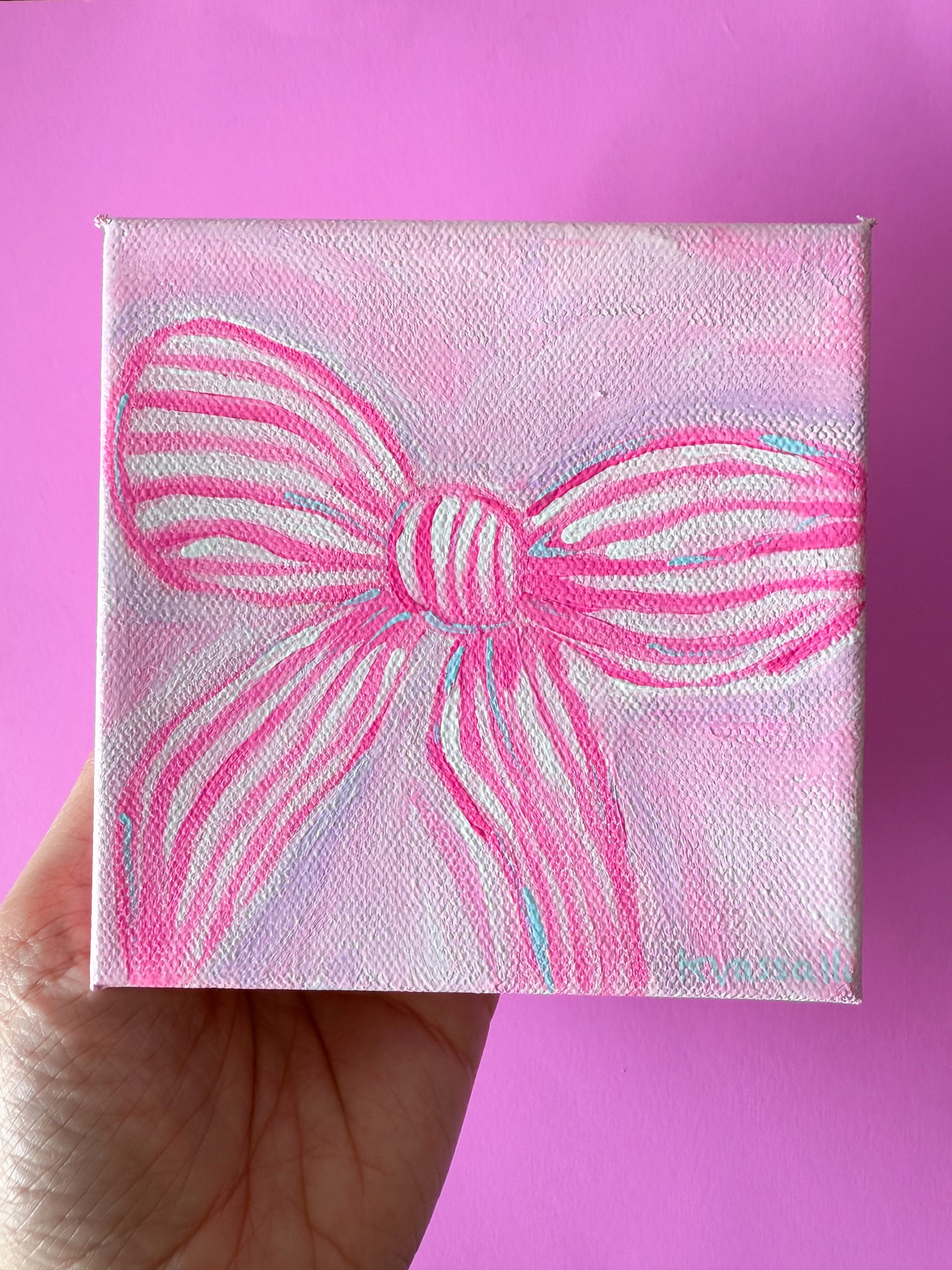 Sweet, soft, and full of charm — this 5x5 hand-painted bow brings a little pop of joy to any space. Brushed in playful striped pinks with hints of teal and glowing highlights, this tiny canvas feels whimsical and girly in all the best ways. Perfect for nurseries, shelf styling, gift tables, or anyone who loves a touch of pretty.