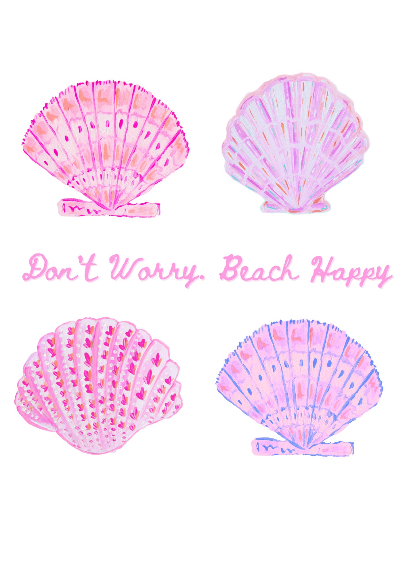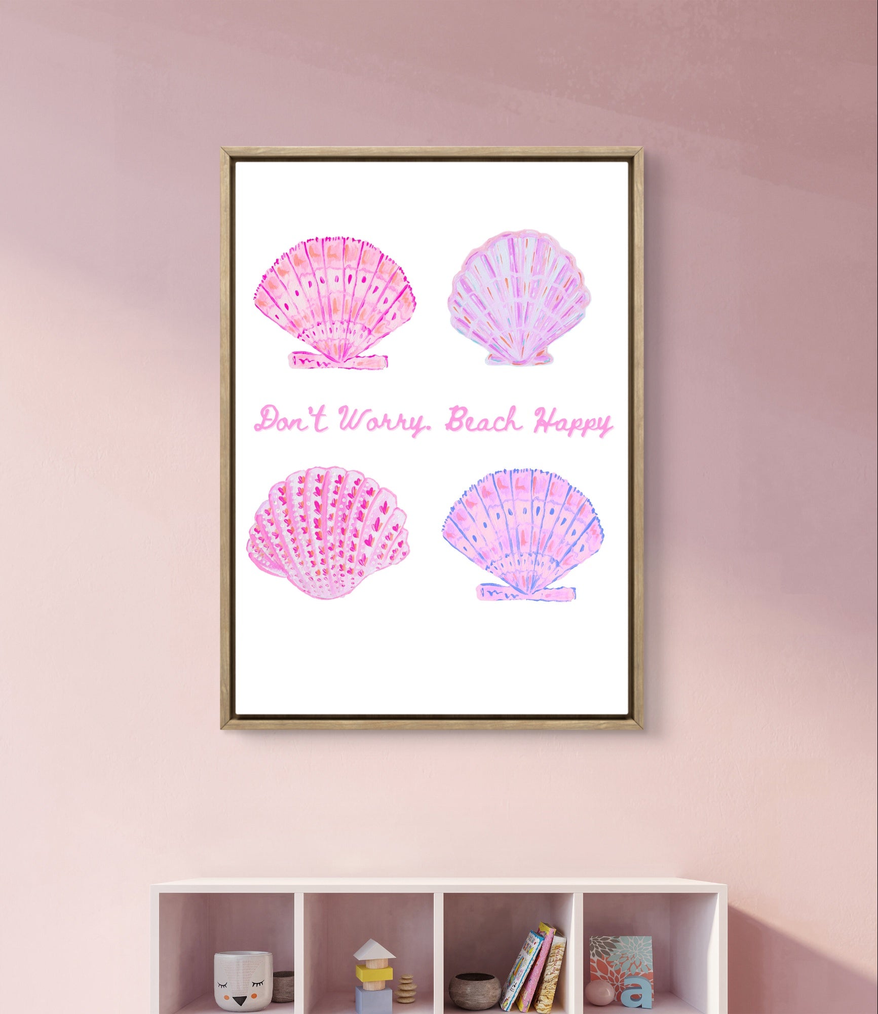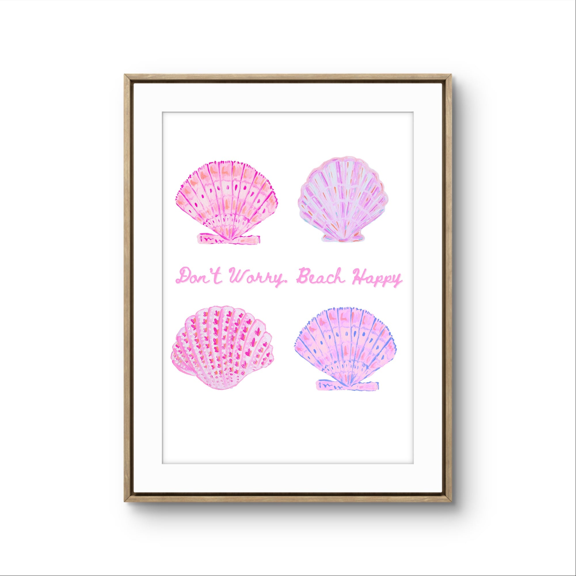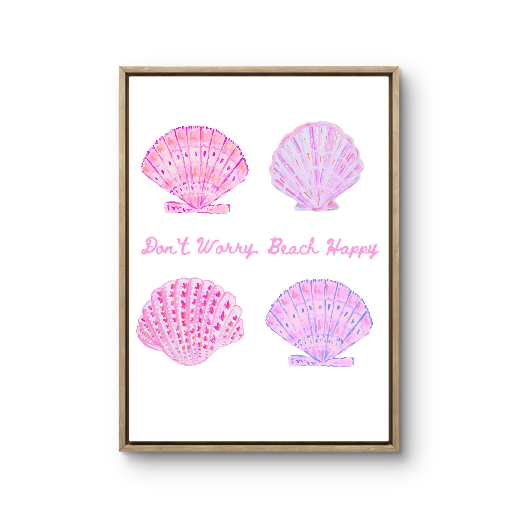 Bring a splash of sunshine and salt air to your walls with this cheerful seashell art print. Featuring four hand-painted pastel shells and the playful phrase “Don’t Worry, Beach Happy,” this piece captures the carefree spirit of coastal living in soft shades of pink, coral, and lavender.
