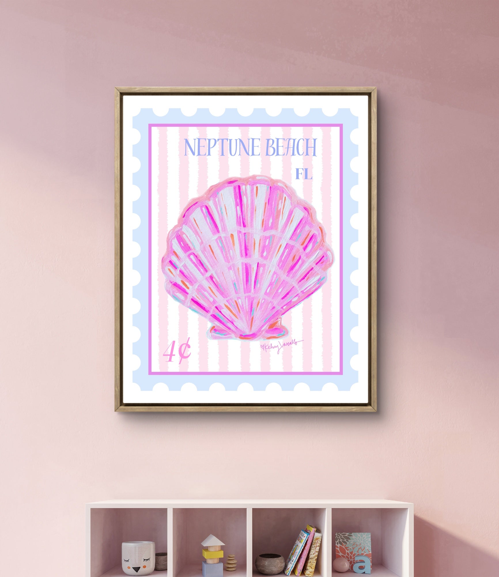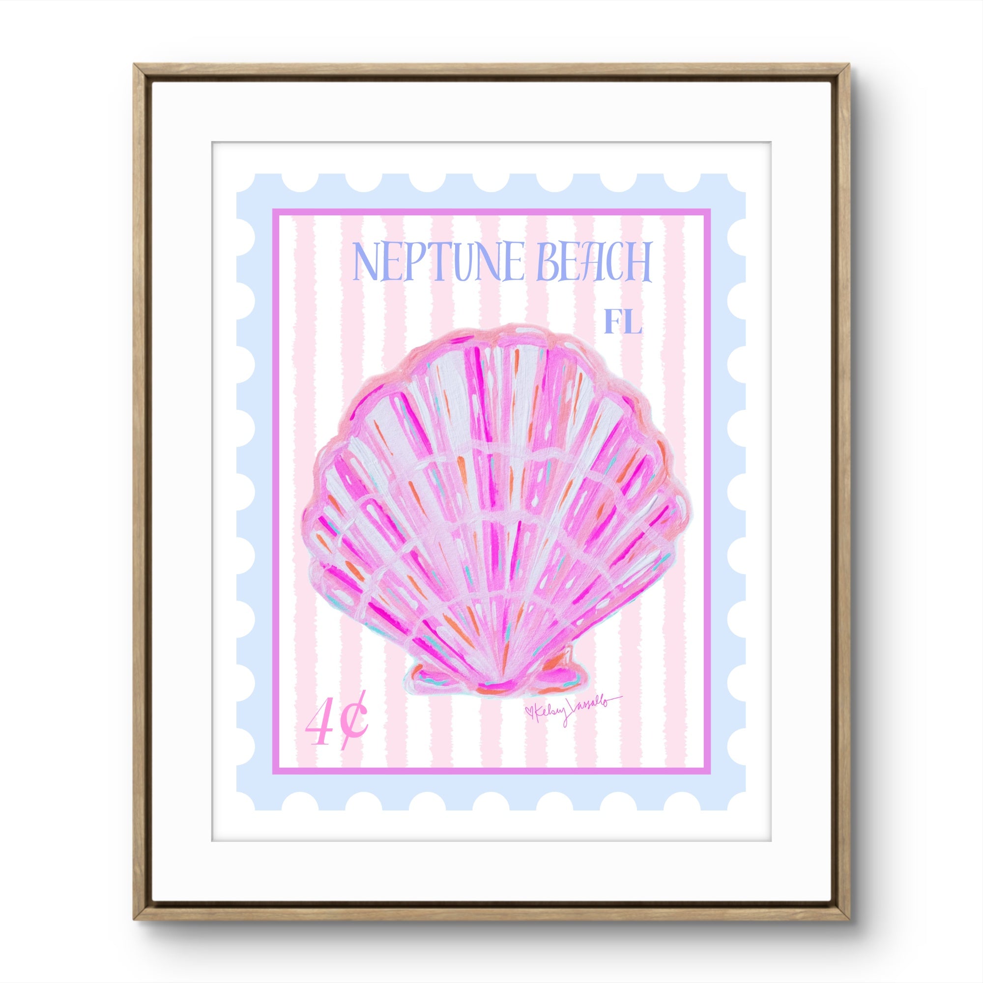 Celebrate the laid-back charm of Florida’s First Coast with this whimsical Neptune Beach Stamp Art Print. Inspired by vintage postage and seaside nostalgia, this hand-painted seashell “stamp” features a softly layered scallop shell in pastel pinks and blues, accented with classic stripes that reflect the breezy, beach-town feel of Neptune Beach.