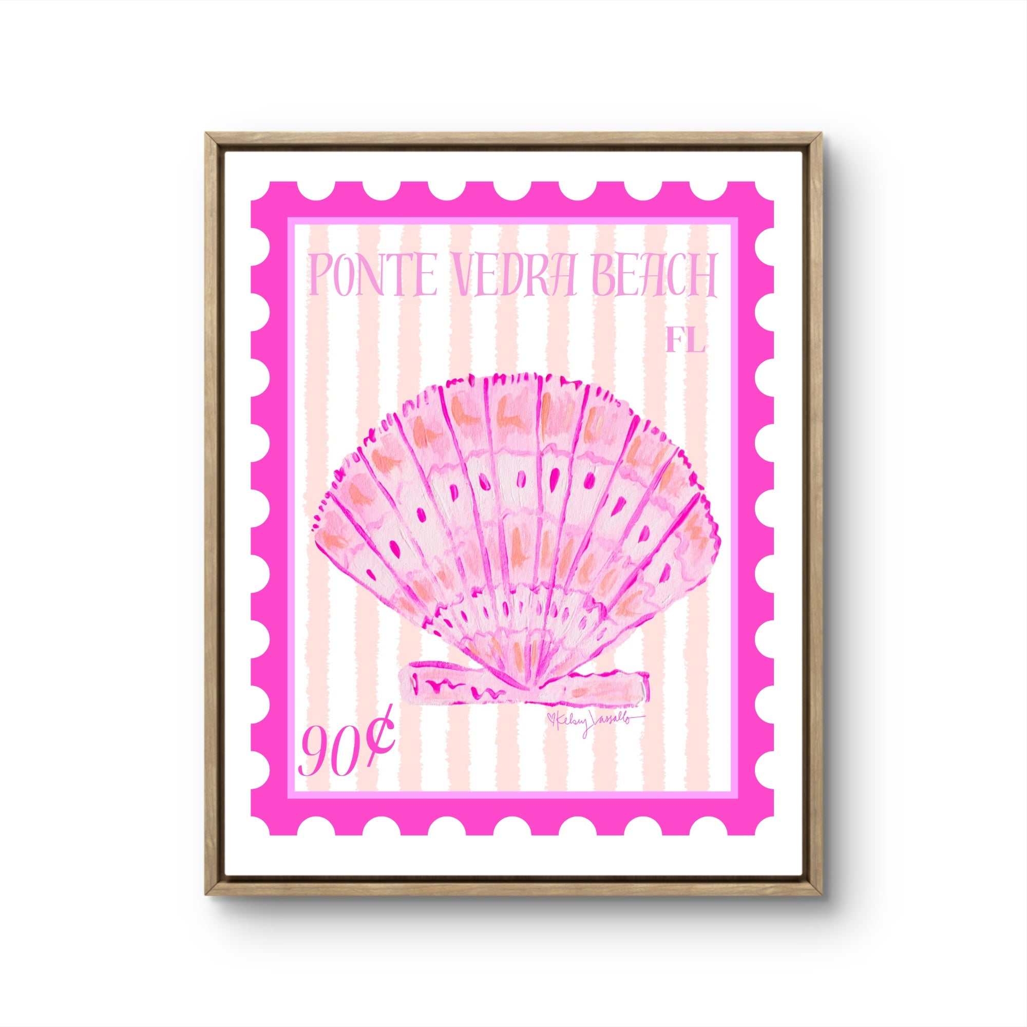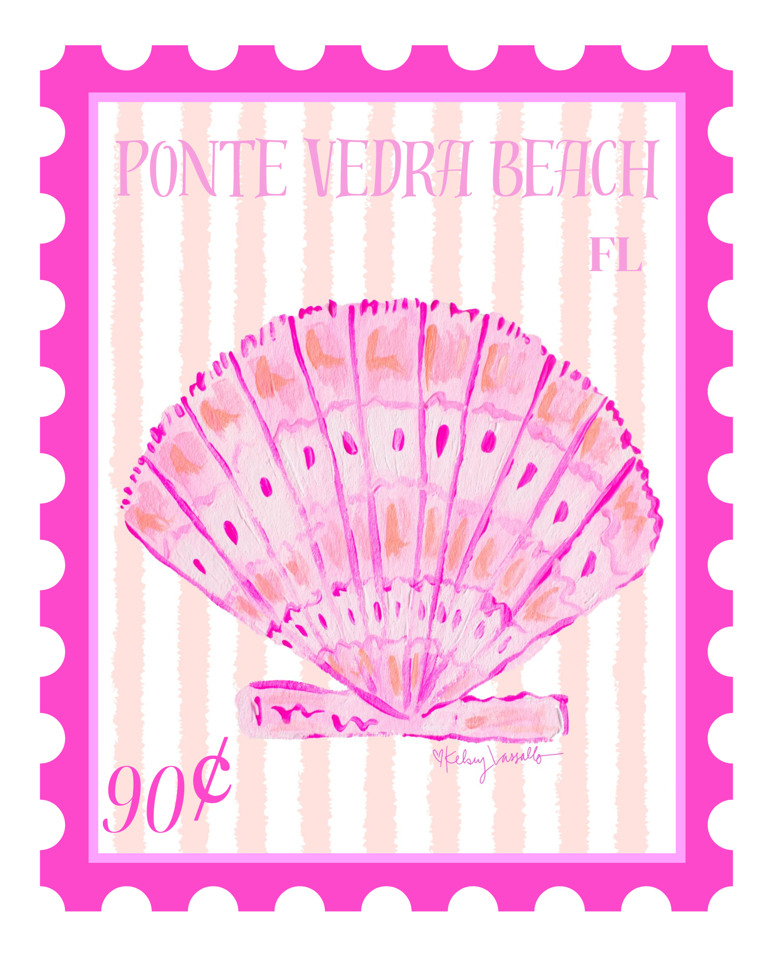Celebrate the laid-back charm of Florida’s First Coast with this whimsical Atlantic Beach Stamp Art Print. Inspired by vintage postage and seaside nostalgia, this hand-painted seashell “stamp” features a softly layered scallop shell in pastel pinks and purples, accented with classic stripes that reflect the breezy, beach-town feel of Atlantic Beach.